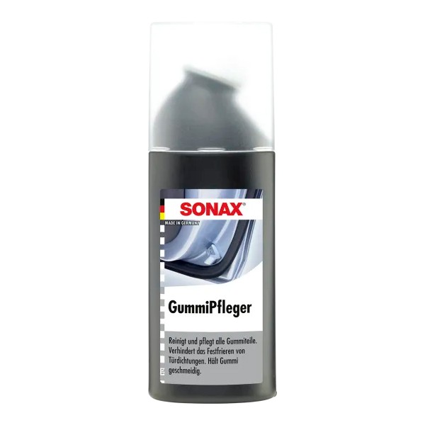 За допомогою засобу для догляду за гумовими ущільнювачами Sonax Gummi Pfleger можна очистити всі гумові елементи інтер'єру автомобіля, зберегти їх еластичність, продовжити їхню службу та освіжити колір. Нанесення засобу запобігає примерзанню ущільнювачів дверей взимку. Також можна легко очистити гумові автомобільні килимки та повернути їм початковий блиск. Sonax Gummi Pfleger поставляється у зручному флаконі з практичним аплікатором у вигляді губки.